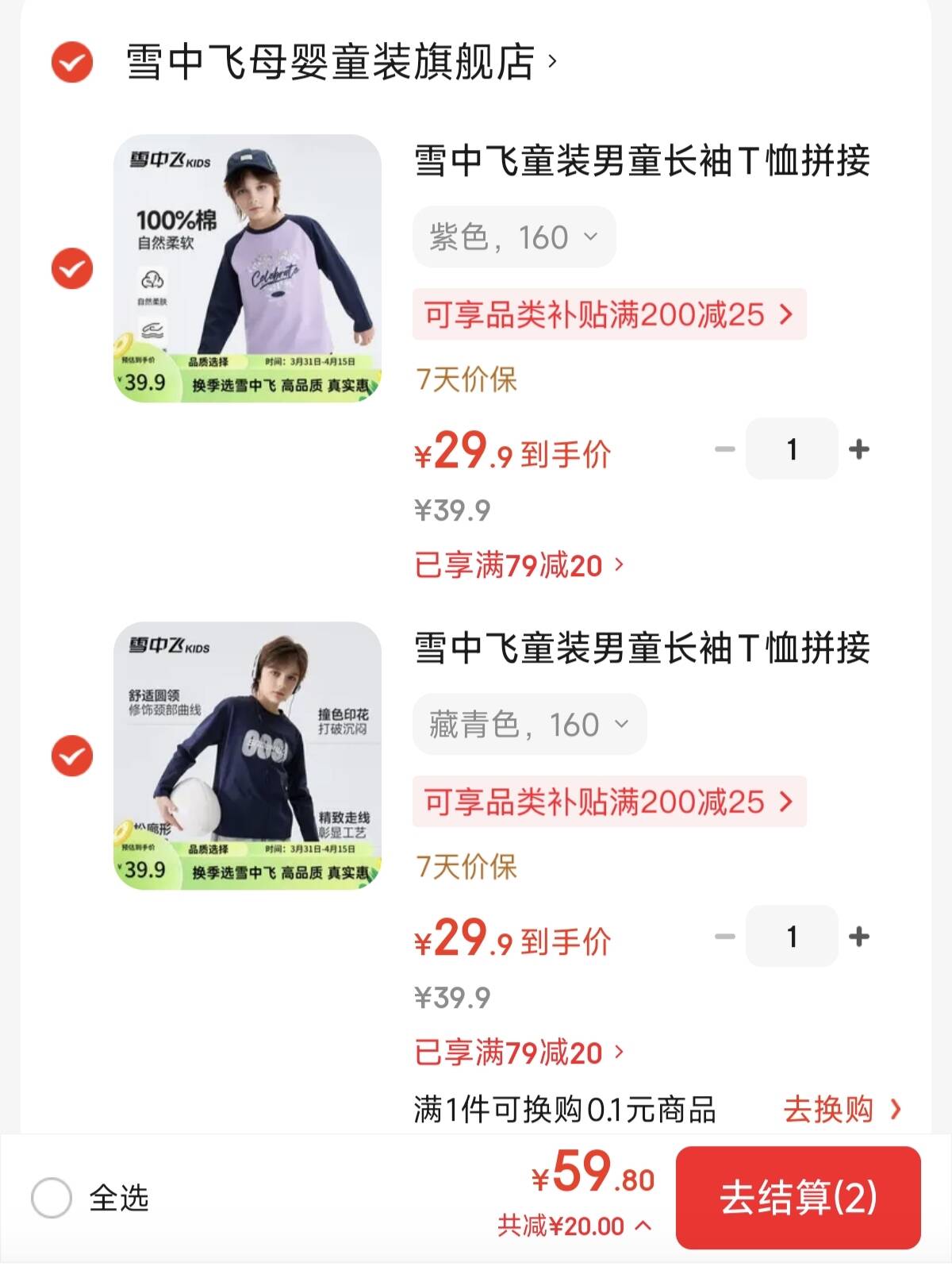 雪中飞儿童长袖T恤任选2件59.8元,折29.9/件