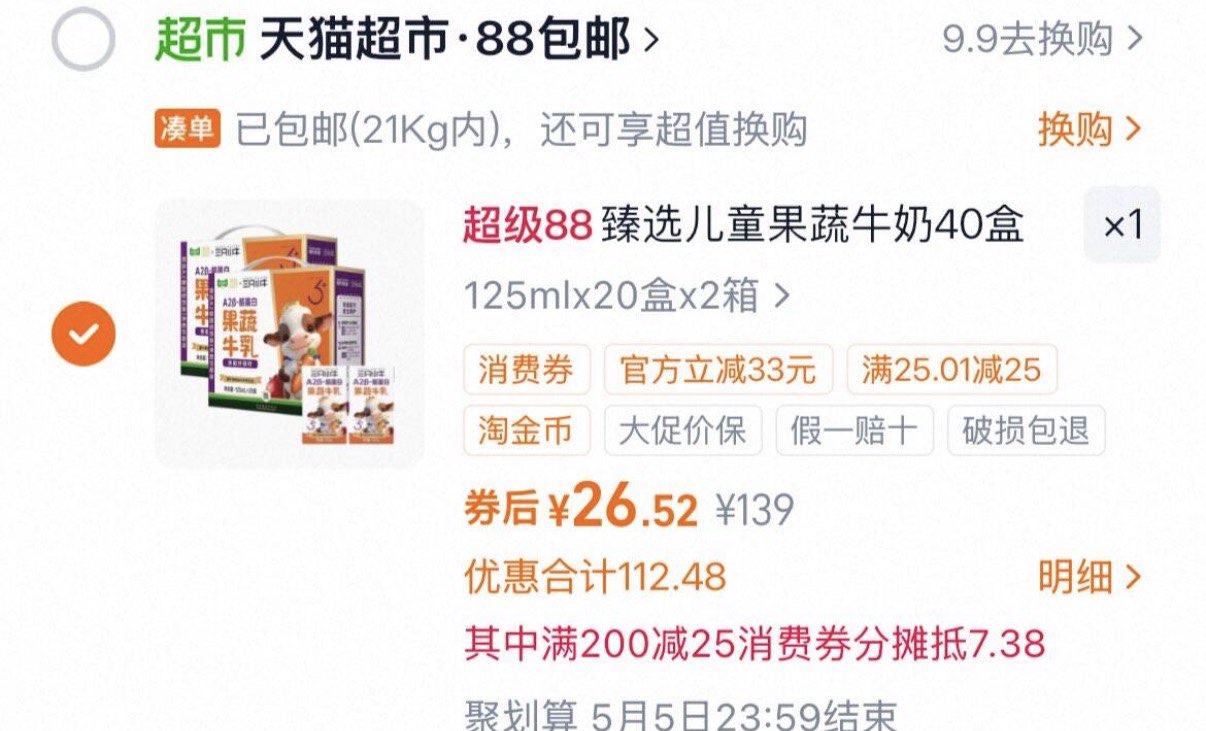 三只小牛 A2果蔬儿童牛奶20盒*2箱 26.5元