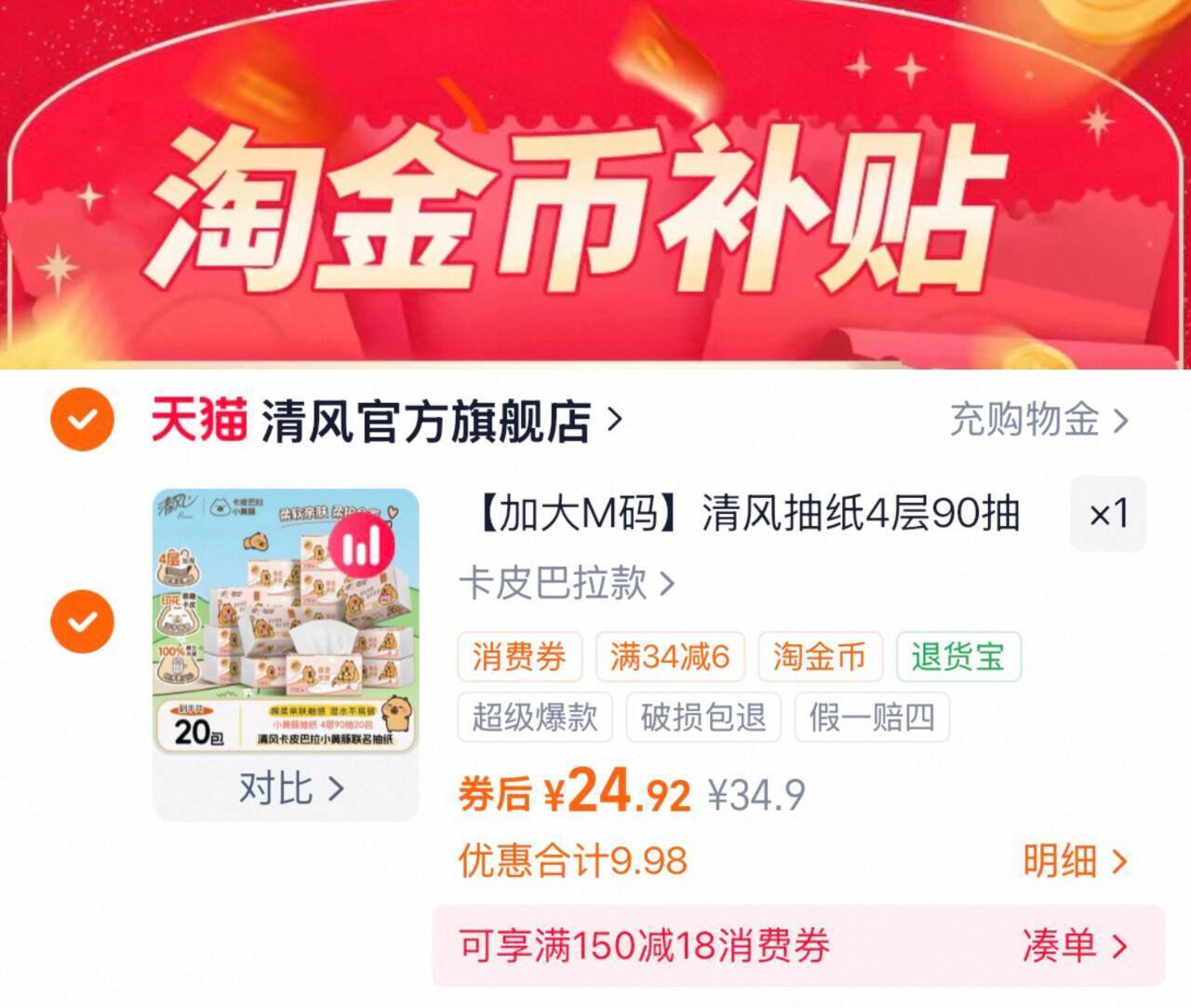 1.2/包 清风卡皮巴拉抽纸90抽 20包 下拉详情到手24.9元