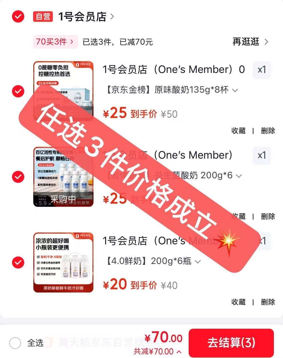 One’s Member 4.0g鲜奶/益生菌酸奶任选3件 70元
