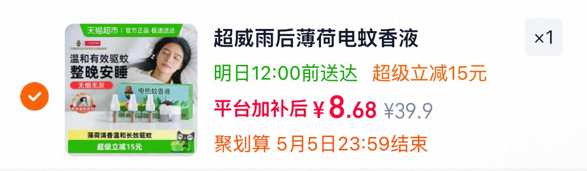 超威家用电蚊香液3瓶1器 8.68元