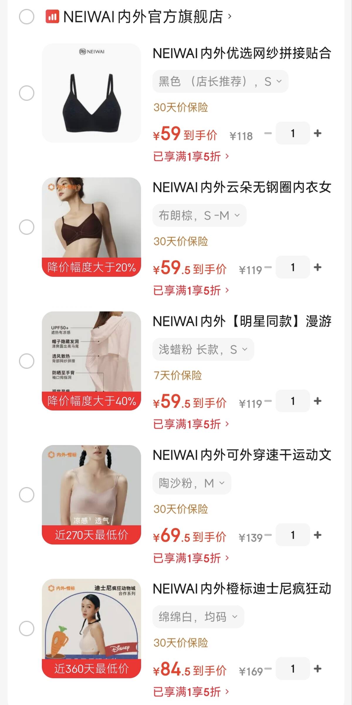 NEIWAI内外59元优选网纱拼接文胸,59.5元云朵无钢圈无痕文胸,59.5元明星同款漫游防晒衣