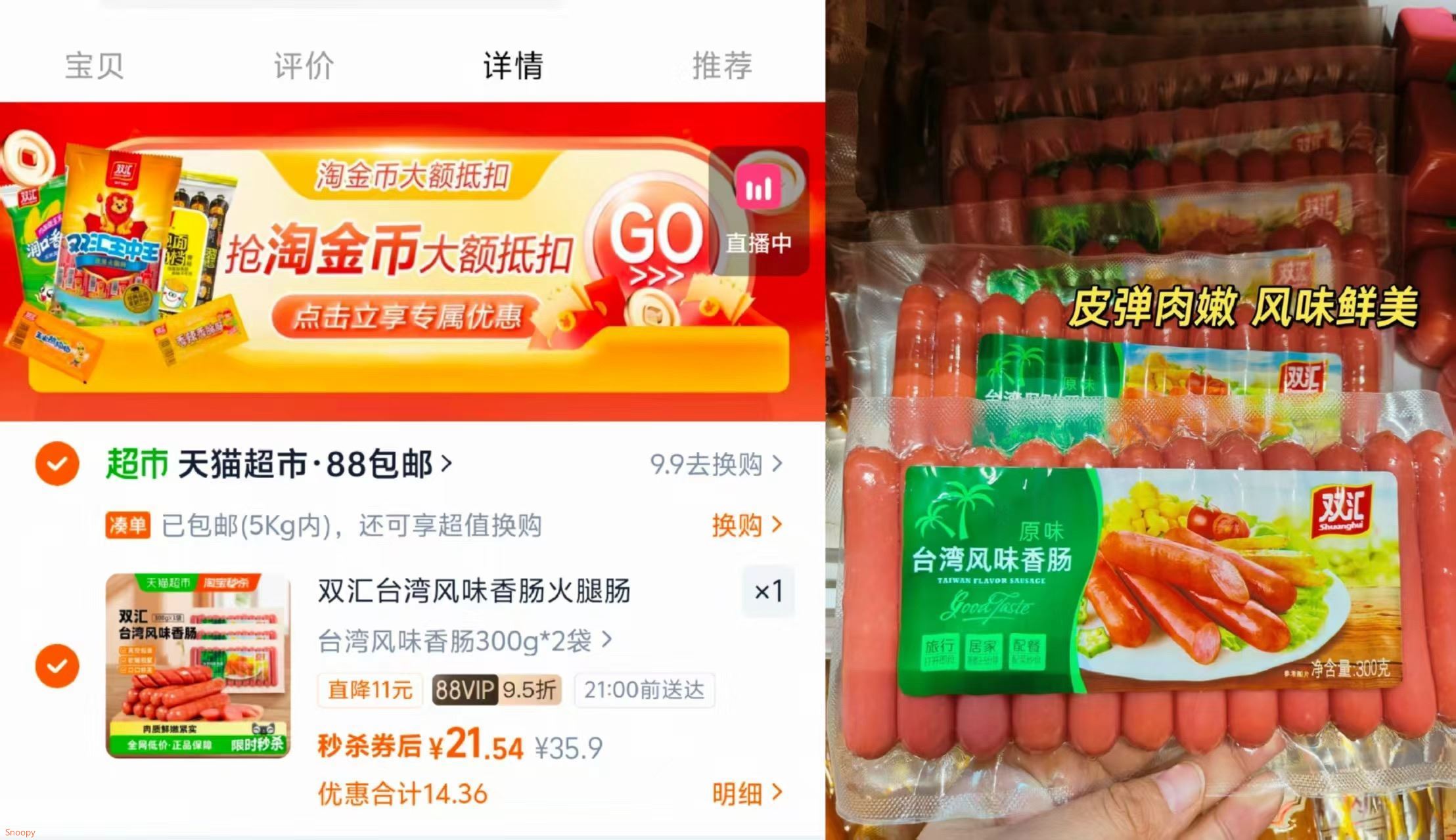 双汇台湾风味肠300g*2袋 21.5元