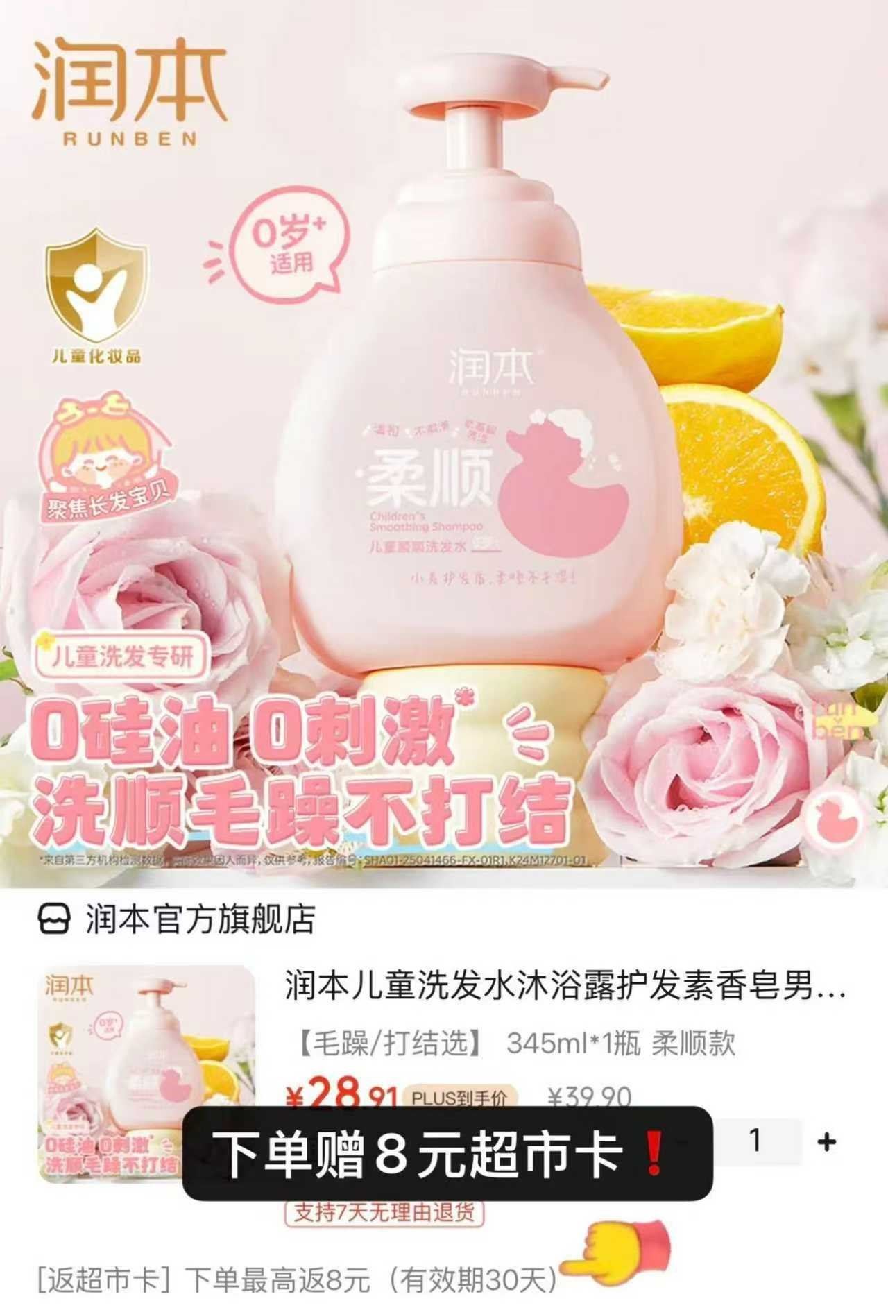 润本个护加码 润本 儿童顺顺洗发水345ml 30.9元