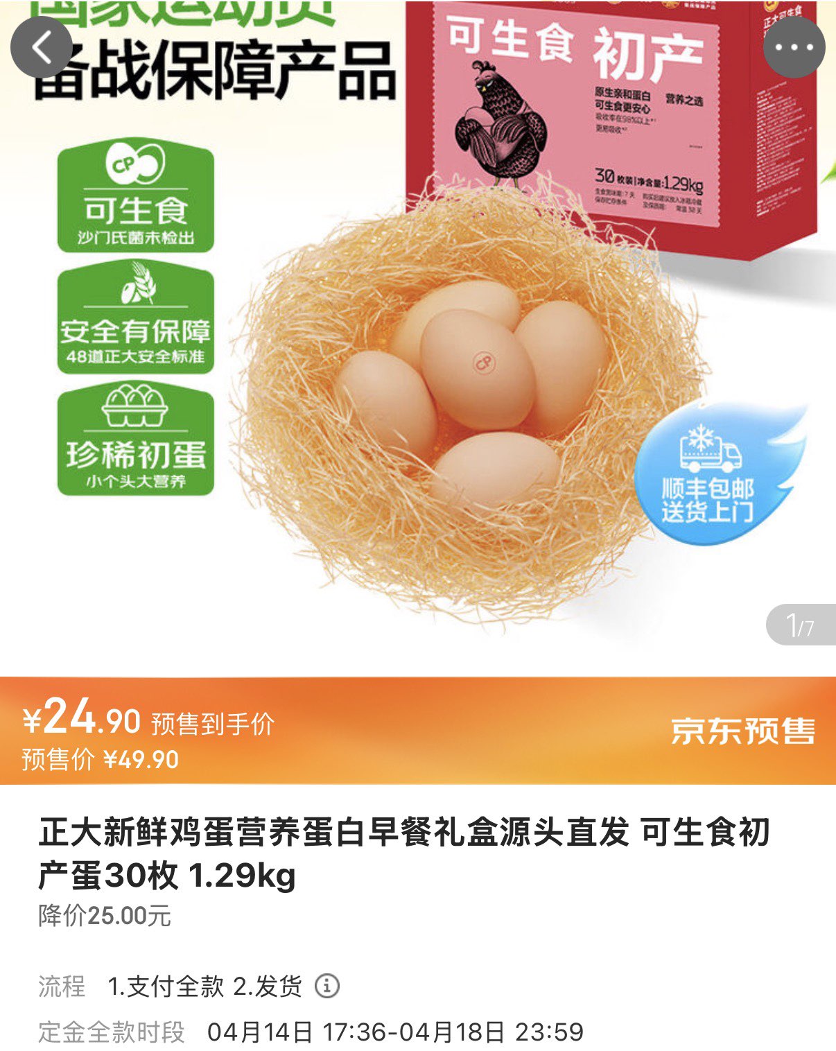 正大可生食初产蛋30枚1.29kg 24.9元