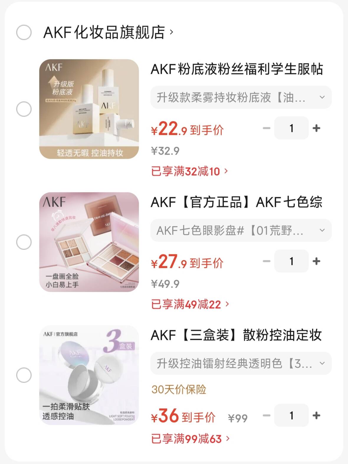 AKF粉底液35g 22.9元,AKF七色眼影盘 27.9元,AKF散粉*三盒装 36元