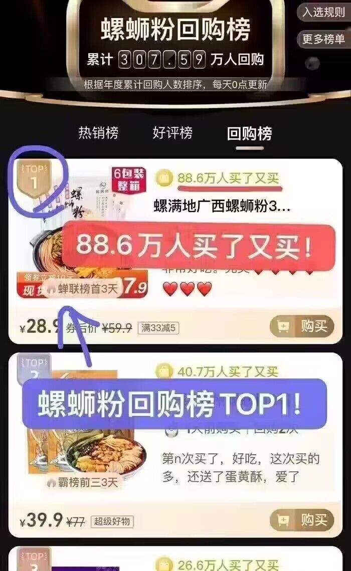 天猫回购排名第一的螺蛳粉!