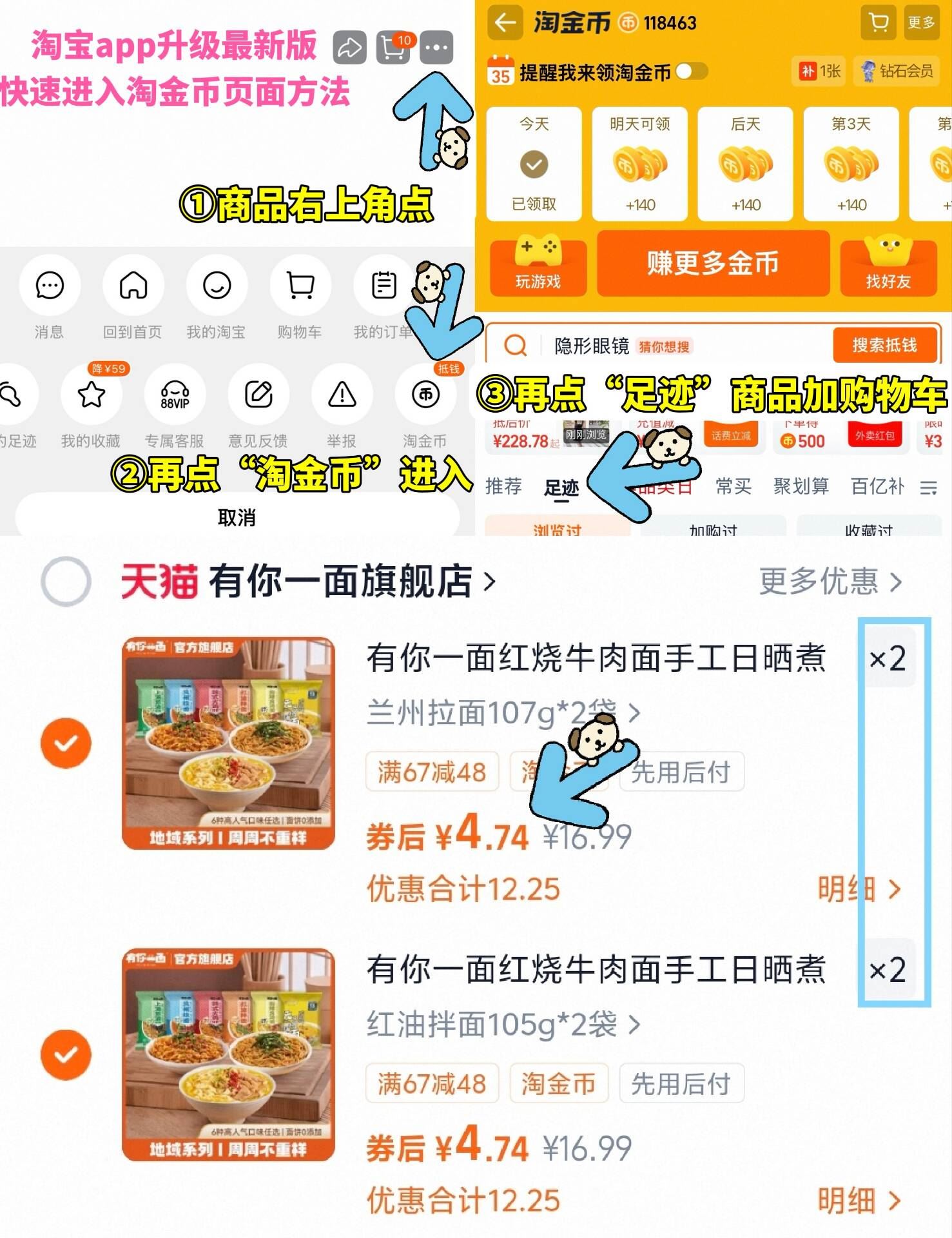 ①如图点右上角3个点,选淘金币