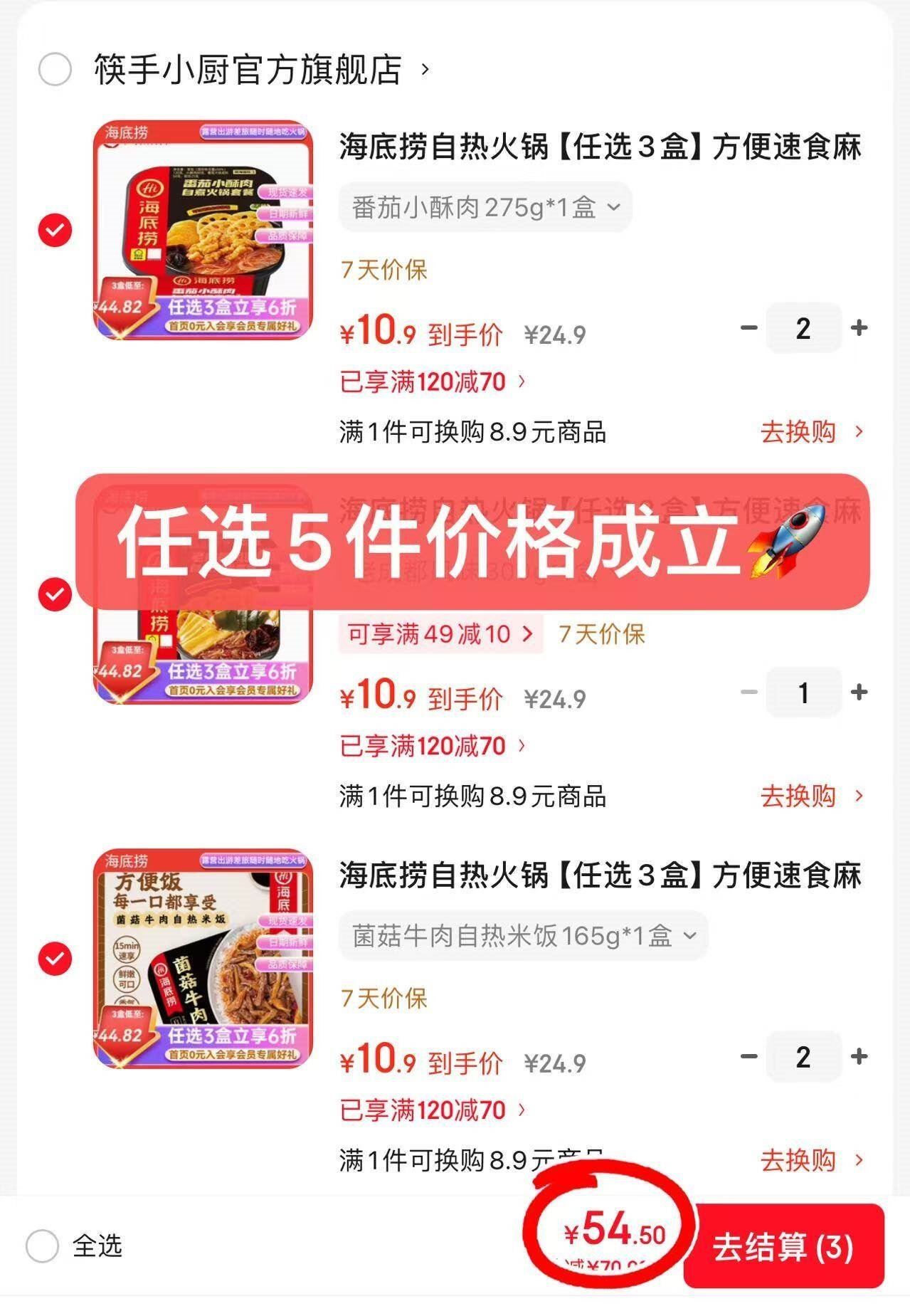 海底捞自热火锅/米饭/拌面任选5件 54.5元