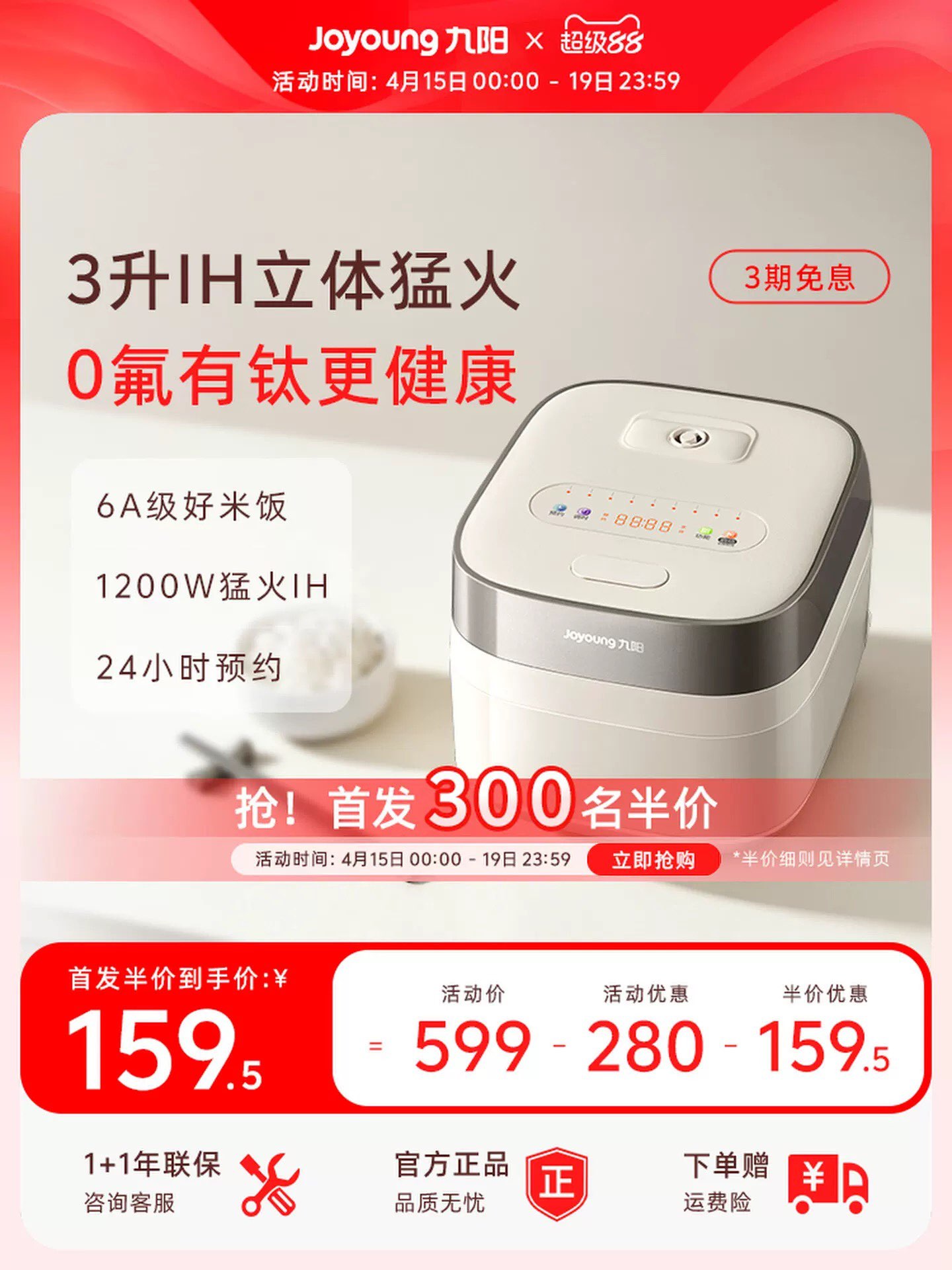 九阳0氟3升IH电饭煲小容量家用迷你多功能升级智能款 159元