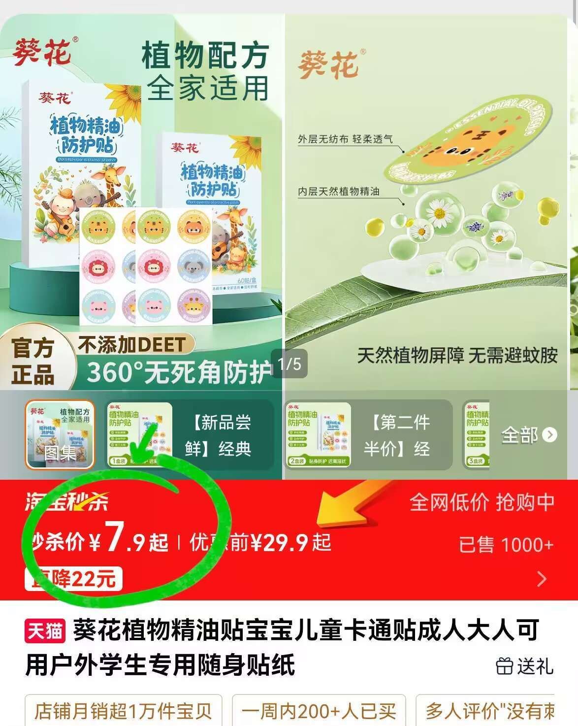 葵花儿童植物精油贴拍1发120贴